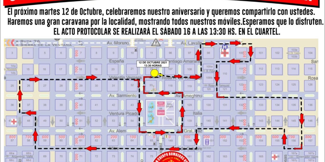 A las 13:30 hs. del próximo martes habrá un toque de sirena que marcará el comienzo de la Cáravana de Móviles y Personal recorriendo las principales arterias de la localidad (adjunto plano del recorrido)
