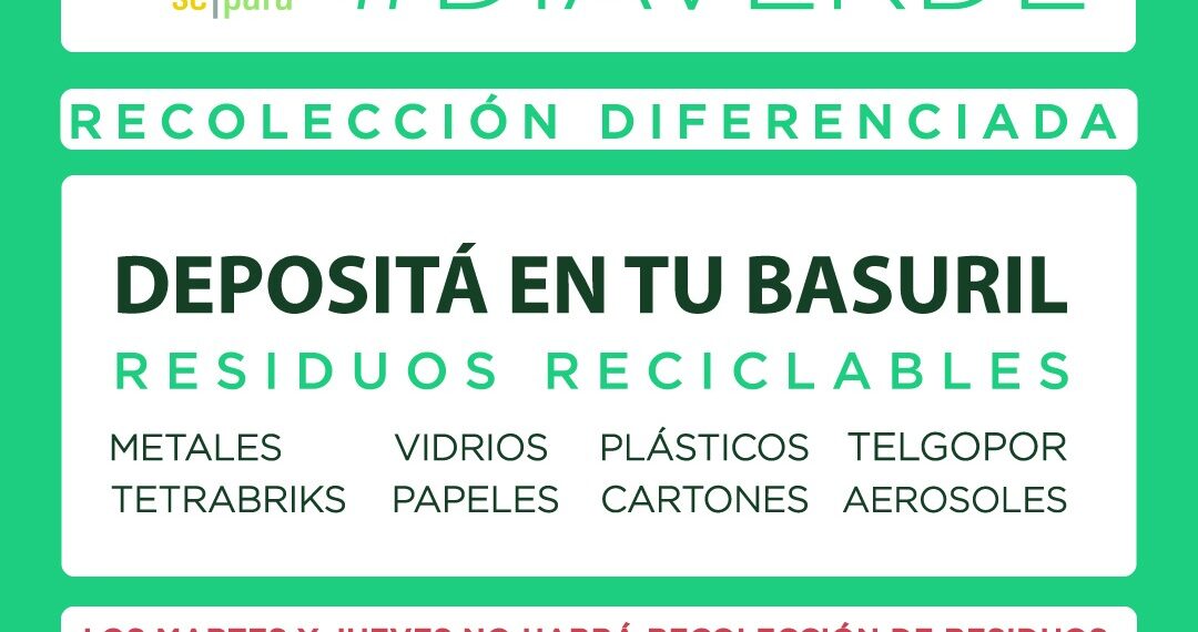 -Martes y jueves: recolección de la bolsa verde, que debe contener residuos reciclables, como papel, cartón, vidrios, plásticos, metal y telgopor;