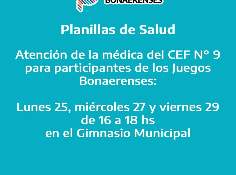 La Subsecretaría de Deportes informa que, la semana que viene, la médica del CEF N° 9 atenderá en el Gimnasio Municipal ‘Eva Perón’ a aquellos inscriptos en los Juegos Bonaerenses 2022 que aún no completaron la planilla de salud.