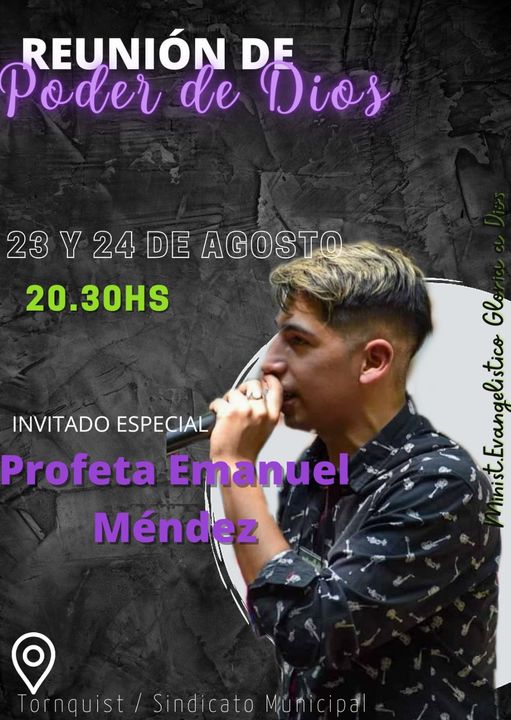 El evento, que es de entrada gratuita y abierto a toda la comunidad, es organizado por el Ministerio Evangelístico “Gloria a Dios” y contará con la presencia del predicador Emanuel Méndez, de Cutral-Có.
