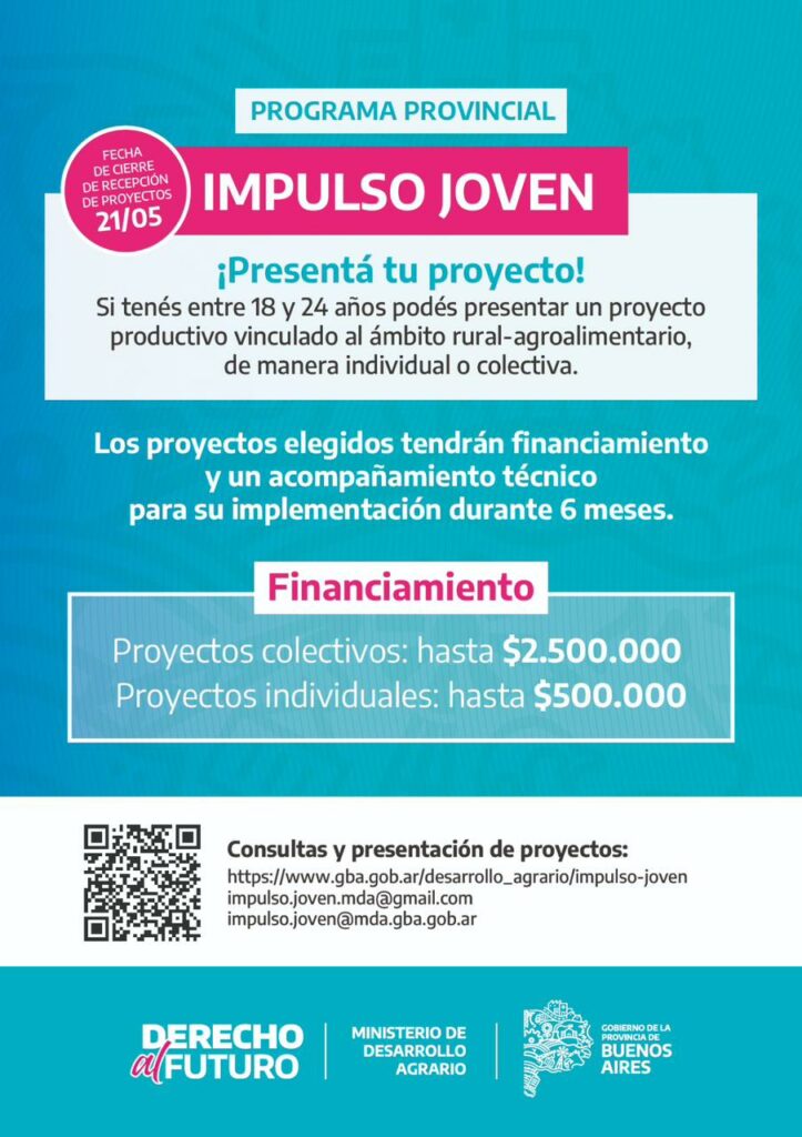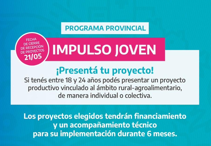 La Secretaria de Producción, Comercio e Industria informa que el Ministerio de Desarrollo Agrario, abrió la inscripción al programa “Impulso Joven”; con el objetivo de potenciar y fomentar los proyectos productivos vinculados al medio rural.