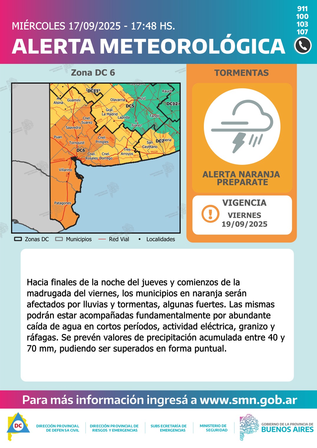 Hacia finales de la noche del jueves y comienzos de la madrugada del viernes (entre las 21 y las 3 h aproximadamente), nuestra zona será afectada por lluvias y tormentas, algunas de ellas fuertes. Estos fenómenos podrán estar acompañados principalmente por abundante caída de agua en cortos períodos, actividad eléctrica, ráfagas y ocasional caída de granizo. Los valores de precipitación acumulada se estiman entre 40 y 70 mm, con posibilidad de superarse de manera puntual.