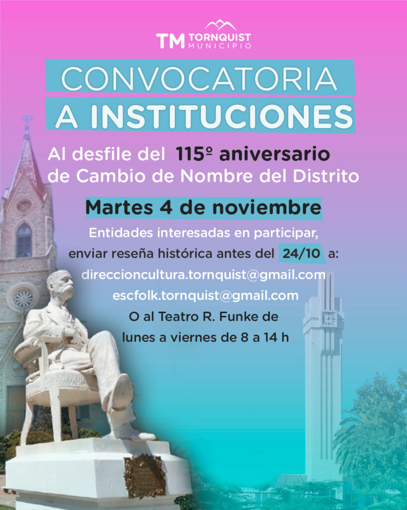 En el marco del 115° aniversario del Cambio de Nombre del Distrito, Tornquist Municipio a través de la Subsecretaría de Cultura invita a todas las instituciones a participar del tradicional desfile que se realizará en la localidad cabecera el 4 de noviembre del 2025.