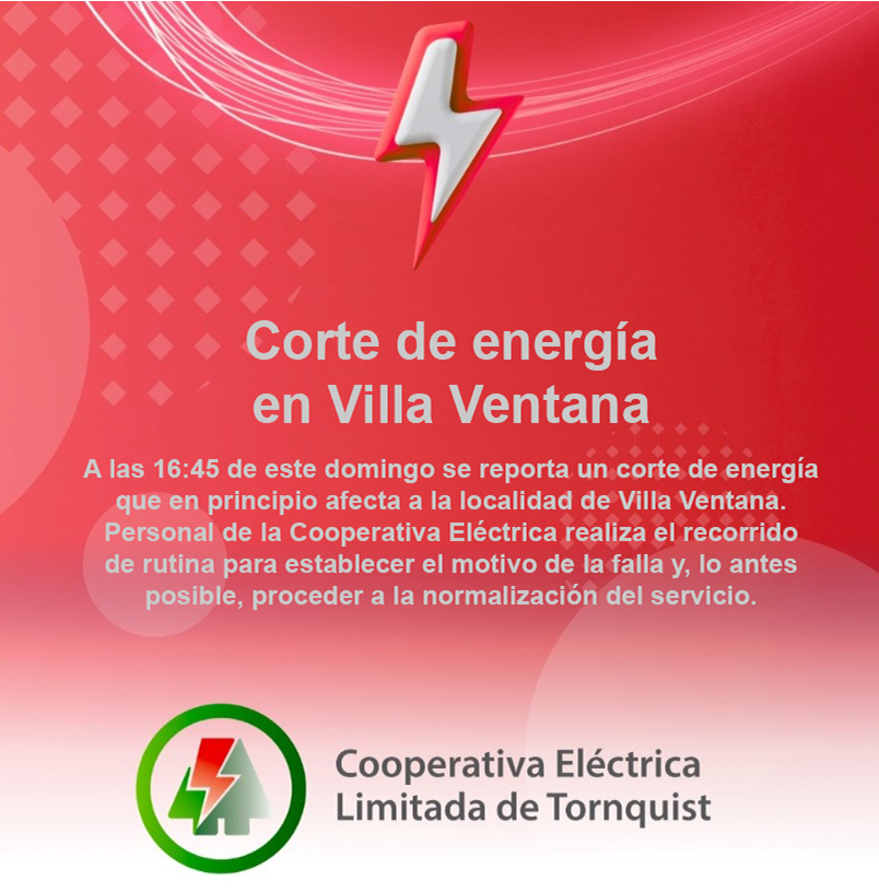A las 16:45 se reporta un corte de energía que en principio afecta a la localidad de Villa Ventana. Personal de la Cooperativa Eléctrica realiza el recorrido de rutina para establecer el motivo de la falla y, lo antes posible, proceder a normalizar el servicio.
