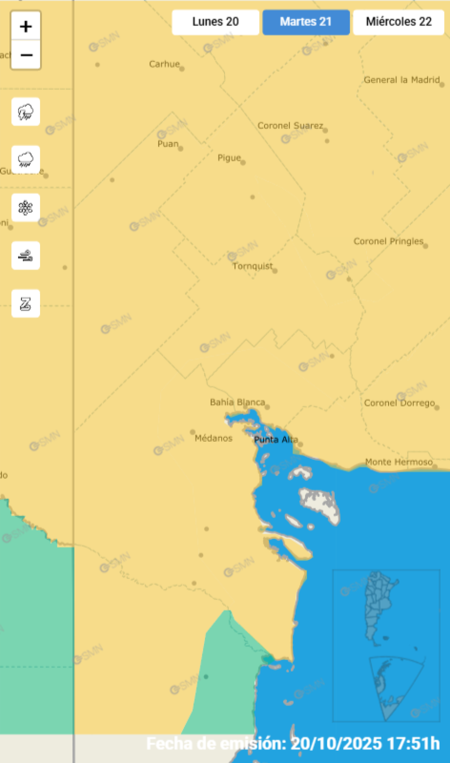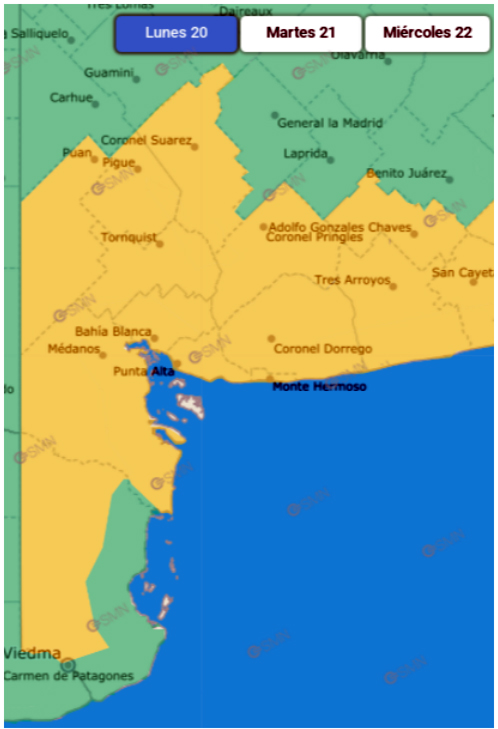 El Servicio Meteorológico Nacional emitió una alerta amarilla por tormentas que abarca a Tornquist y zonas cercanas, incluyendo Brand Norte de Bahía Blanca, Oeste de Patagones, Oeste de Villarino, Puan, y las zonas bajas de Coronel Pringles, Coronel Suárez, Saavedra y Tornquist.