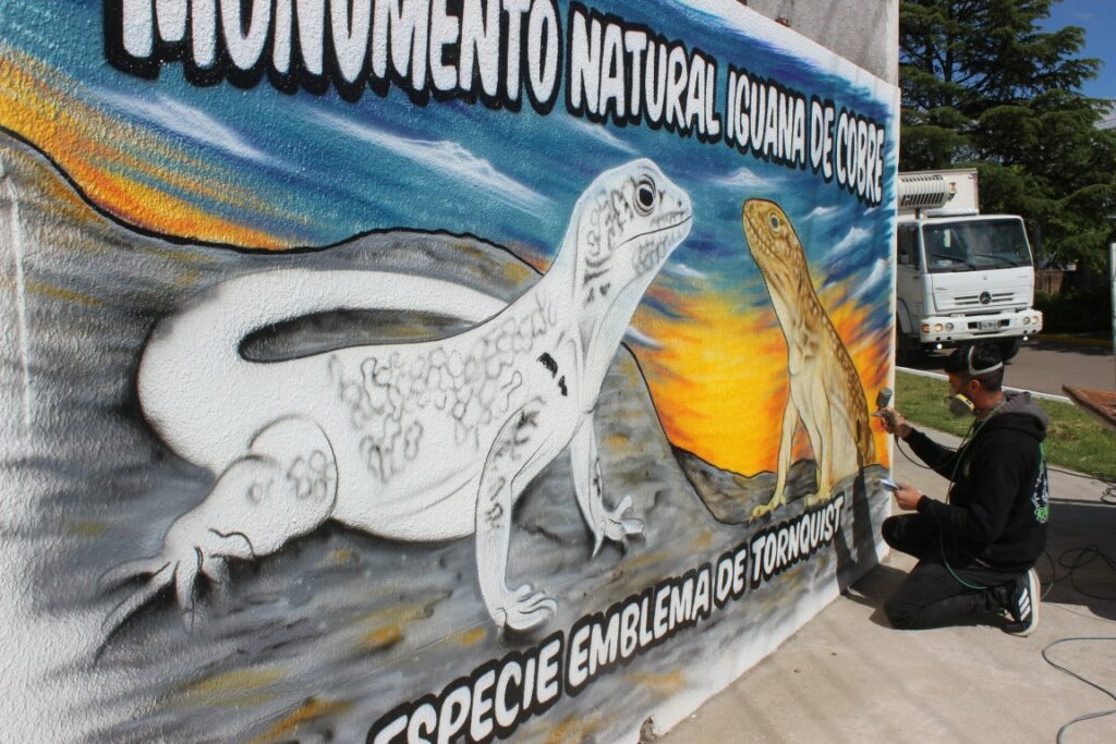 En una esquina muy transitada de Tornquist, en la intersección de las calles 9 de Julio y Valentín Vergara, una nueva obra de arte urbano invita a reflexionar sobre la conservación de la fauna local. Se trata de un mural realizado por el artista local Manuel “Manu” Abarzua, que representa a la iguana de cobre, especie emblemática del distrito y en peligro crítico de extinción.