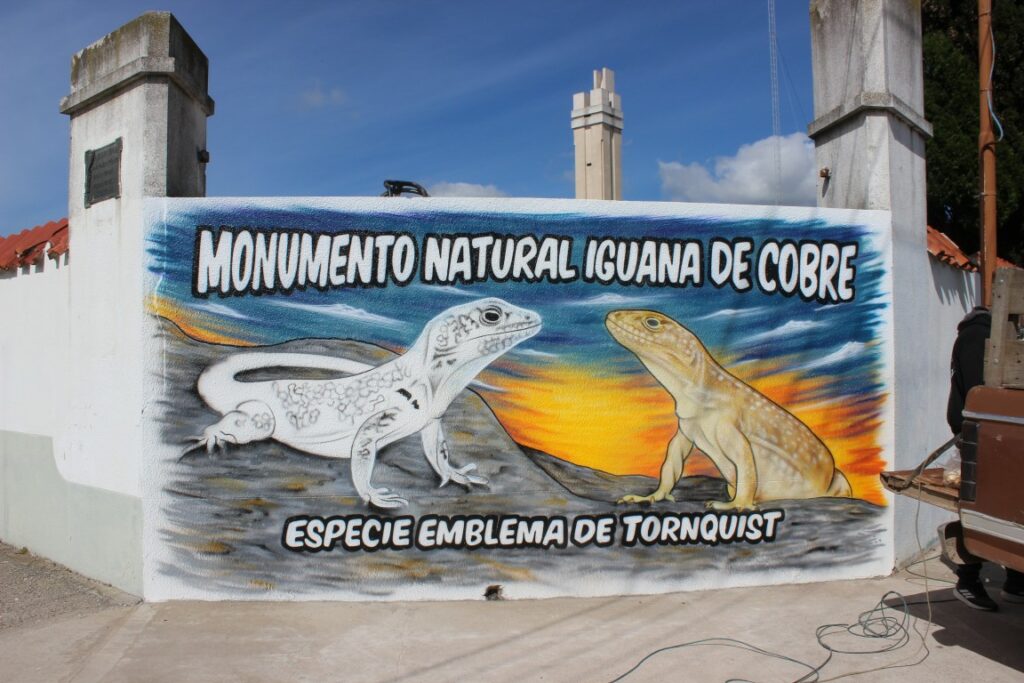 En una esquina muy transitada de Tornquist, en la intersección de las calles 9 de Julio y Valentín Vergara, una nueva obra de arte urbano invita a reflexionar sobre la conservación de la fauna local. Se trata de un mural realizado por el artista local Manuel “Manu” Abarzua, que representa a la iguana de cobre, especie emblemática del distrito y en peligro crítico de extinción.