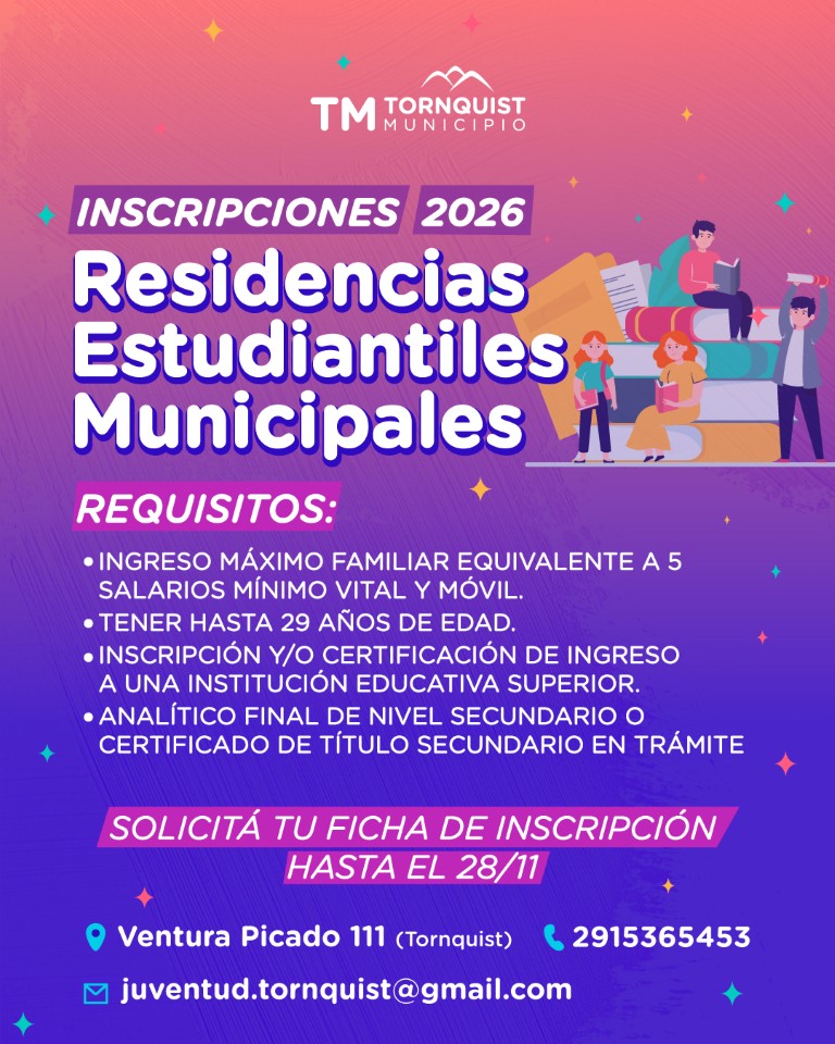 La Subsecretaría de Infancias y Juventudes de Tornquist Municipio, informa que, hasta el 28 de noviembre, se encuentran abiertas las inscripciones 2026 a las residencias estudiantiles de Bahía Blanca y La Plata.