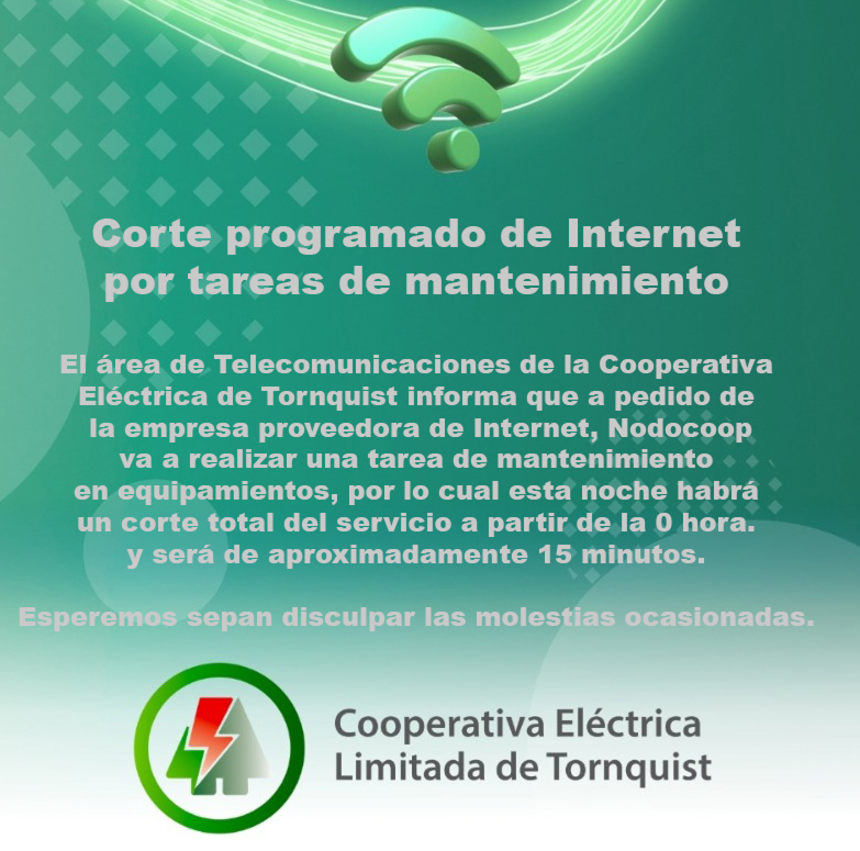 El área de Telecomunicaciones de la Cooperativa Eléctrica de Tornquist informa que a pedido de la empresa proveedora de Internet Nodocoop va a realizar una tarea de mantenimiento en los equipos , por lo cual esta noche habrá un corte total del servicio a partir de la 0 hora. y será de aproximadamente 15 minutos.