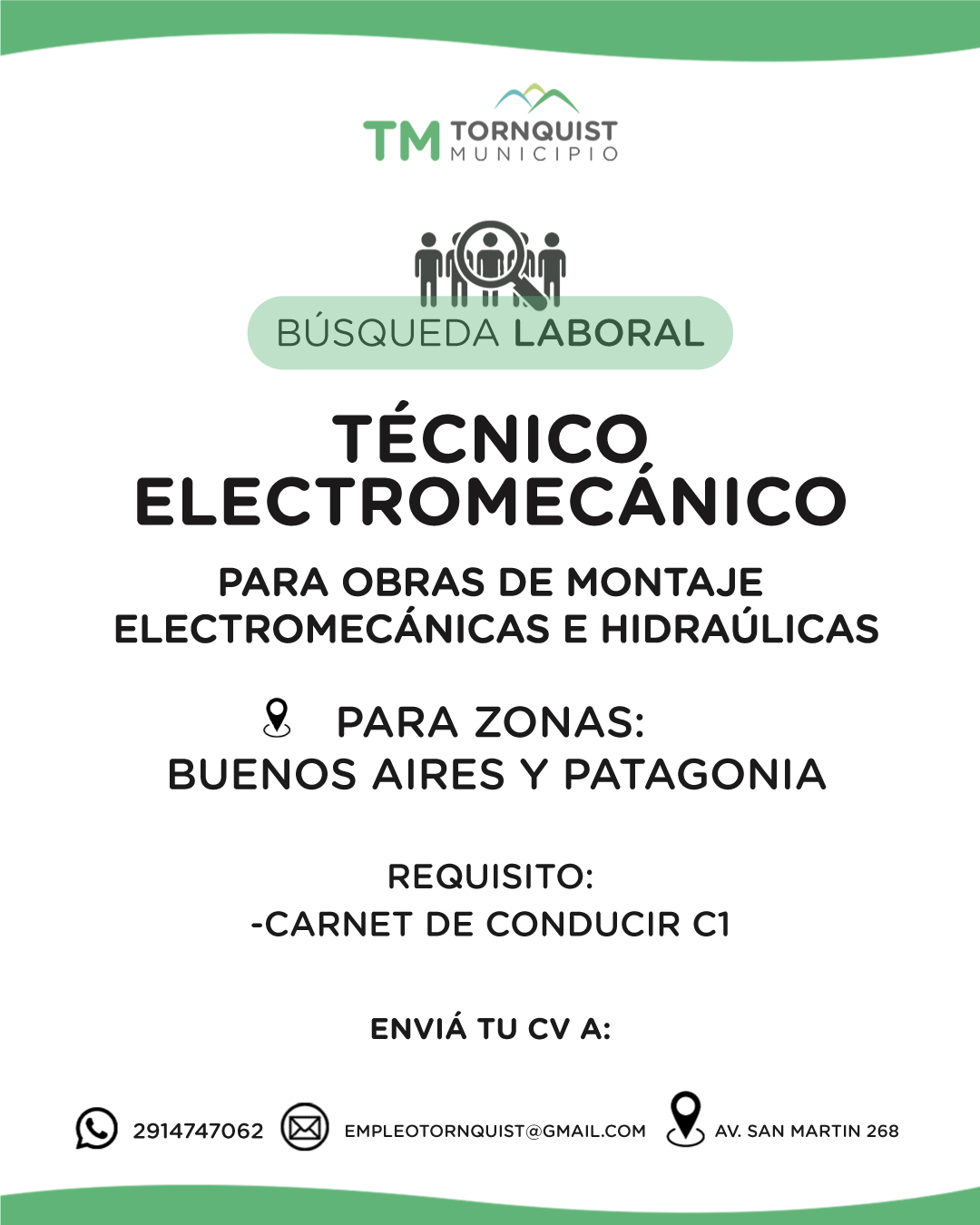 La Oficina de Empleo de Tornquist Municipio, se encuentra en la búsqueda de un/a Técnico Electromecánico para desempeñarse en zonas de Buenos Aires y Patagonia, con obras de montaje electromecánicas e hidráulicas.