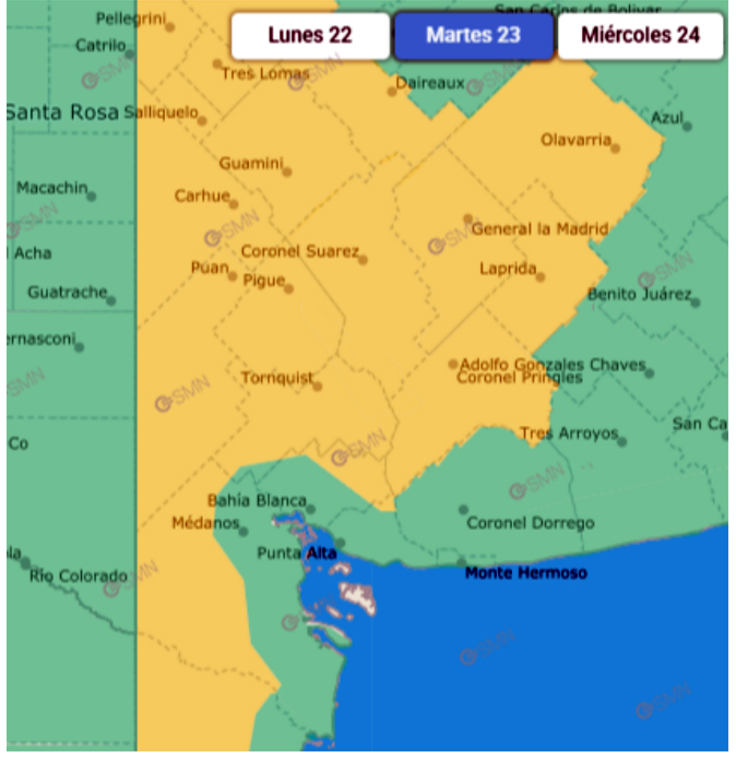 En este caso, las ciudades de Bahía Blanca, Punta Alta y Monte Hermoso quedan por fuera del área comprendido por la advertencia.