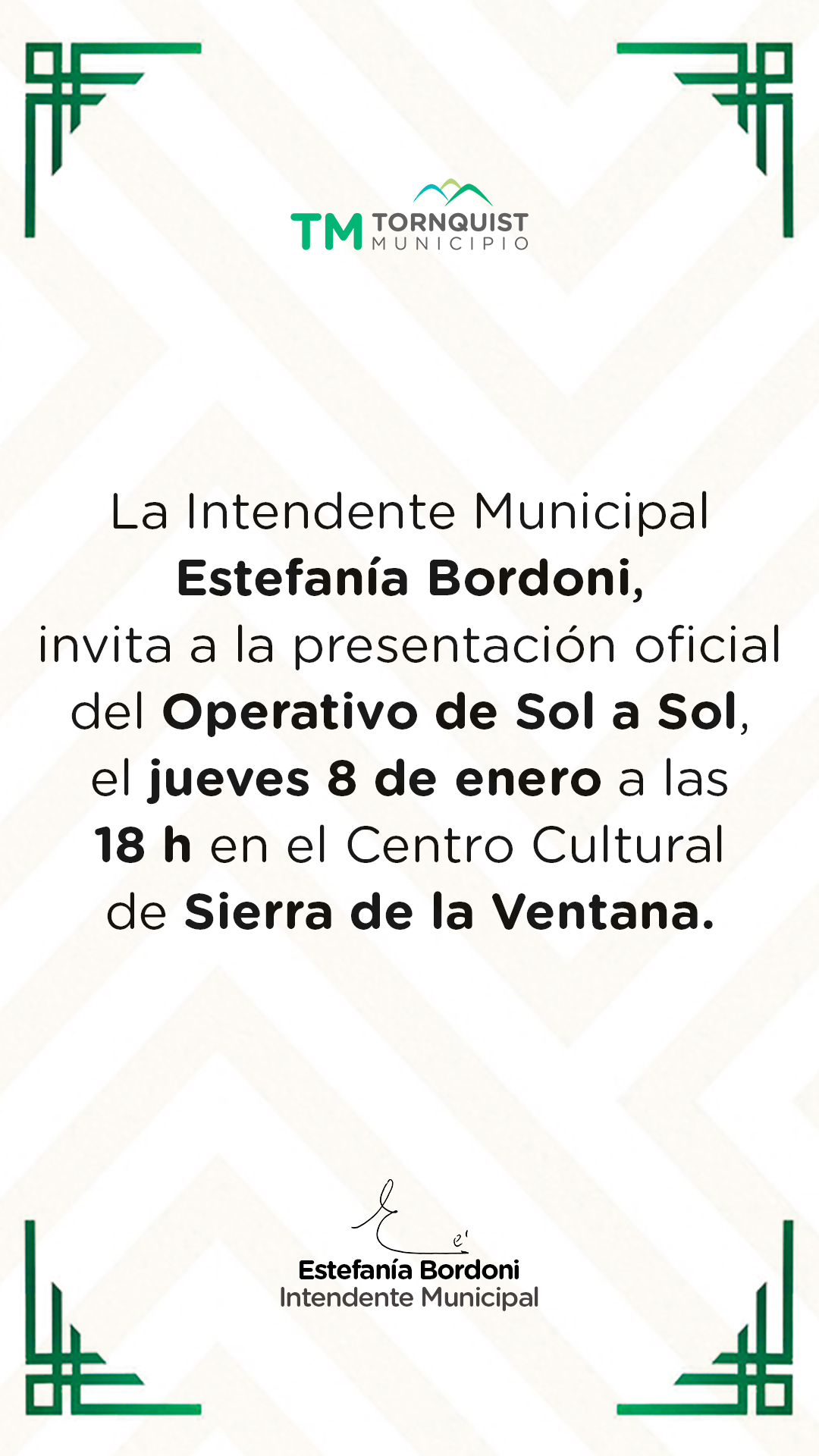 La Intendente Municipal, Estefanía Bordoni, invita a la comunidad a participar de lapresentación oficial del Operativo de Sol a Sol, que se llevará a cabo el jueves 8 de enero, a las 18 horas, en el Centro Cultural de Sierra de la Ventana.