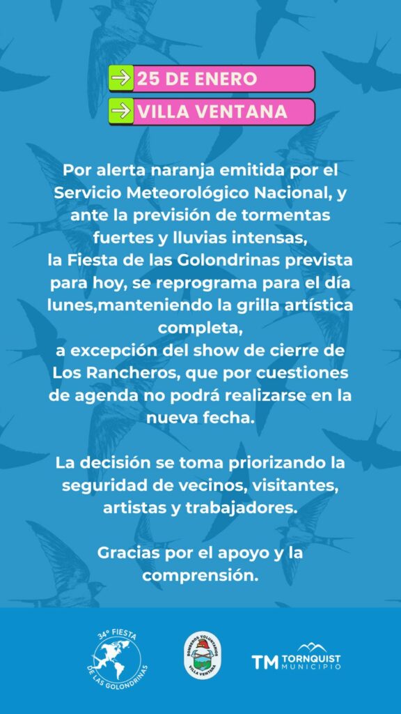 La Comisión Organizadora de la Fiesta Provincial de las Golondrinas y Tornquist Municipio informan que, debido al alerta naranja emitido por el Servicio Meteorológico Nacional para este domingo, la segunda jornada del evento fue reprogramada para este lunes 26.