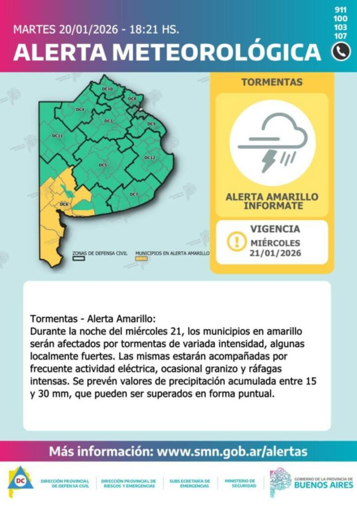 Según el organismo, el área será afectada por tormentas de variada intensidad, algunas localmente fuertes. Las mismas estarán acompañadas principalmente por lluvias abundantes en cortos períodos, frecuente actividad eléctrica, granizo, y ráfagas intensas que pueden alcanzar los 75 kilómetros por hora. Se prevén valores acumulados entre 20 y 50 milímetros, pudiendo ser superados de manera puntual.