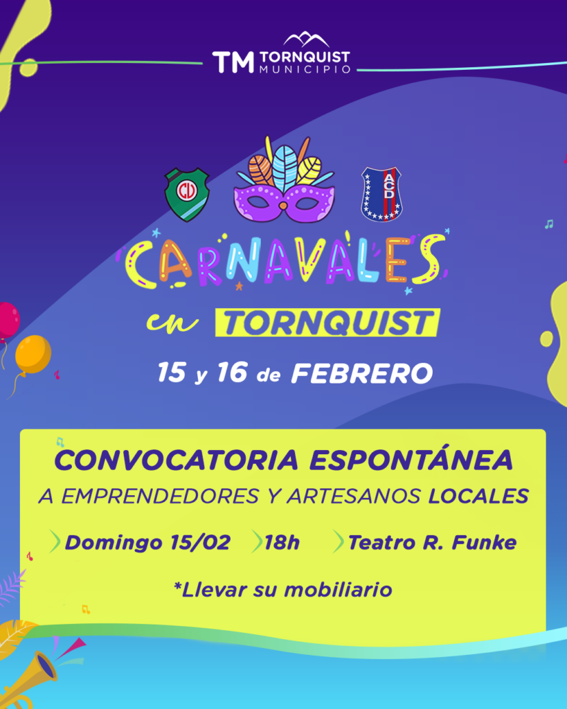 La Subsecretaría de Cultura informa que se encuentra abierta la convocatoria destinada a emprendedores y artesanos locales que deseen participar en los Carnavales de Tornquist, que se llevarán a cabo los días 15 y 16 de febrero.