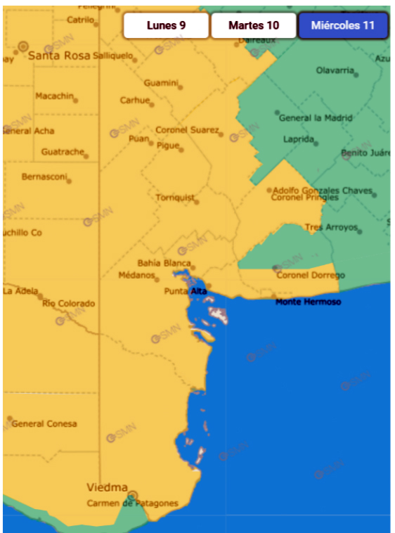 El aviso contempla los distritos de Patagones, Villarino, Puan, Bahía Blanca, sur de Coronel Dorrego, Monte Hermoso, Saavedra, Coronel Rosales, Tornquist y Coronel Suárez, además de la provincia de La Pampa y gran parte de Río Negro.