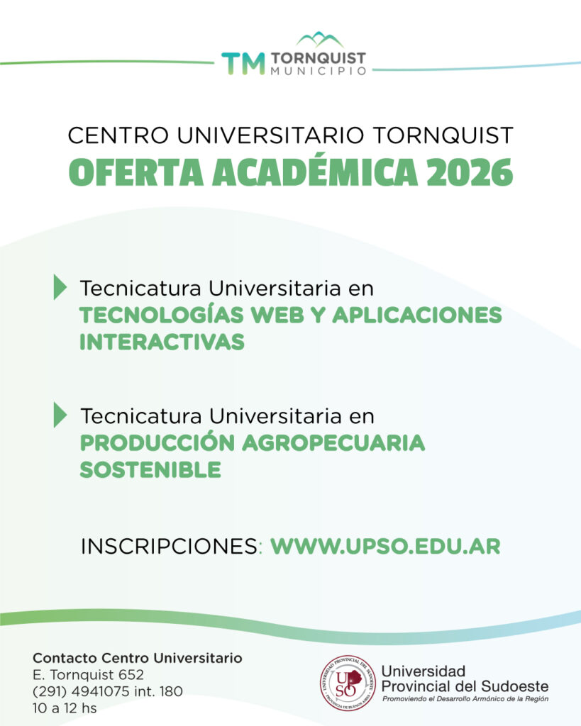 Se encuentran abiertas, hasta el 20 de febrero, las inscripciones para dos nuevas carreras que dictará la Universidad Provincial del Sudoeste (UPSO), desde este año en el Centro Universitario ‘Elsa Kaltembach’ de Tornquist.