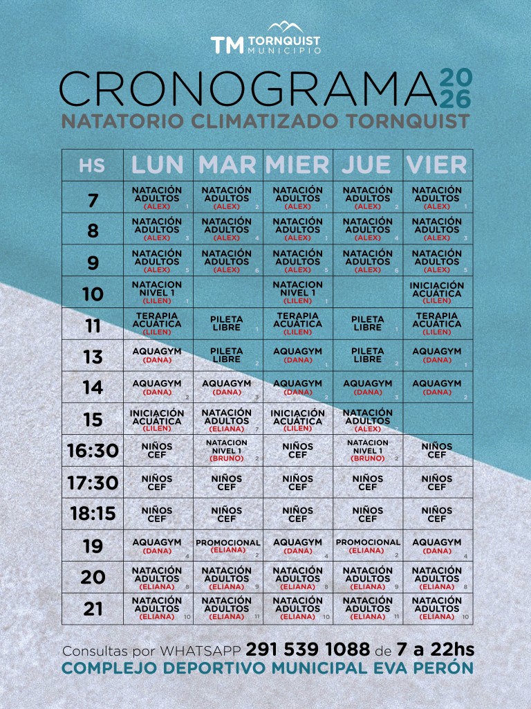 La Subsecretaría de Deportes informa que se encuentran abiertas las inscripciones 2026 para el Natatorio Climatizado Municipal de Tornquist, cuyas actividades iniciarán el lunes 23 de febrero.