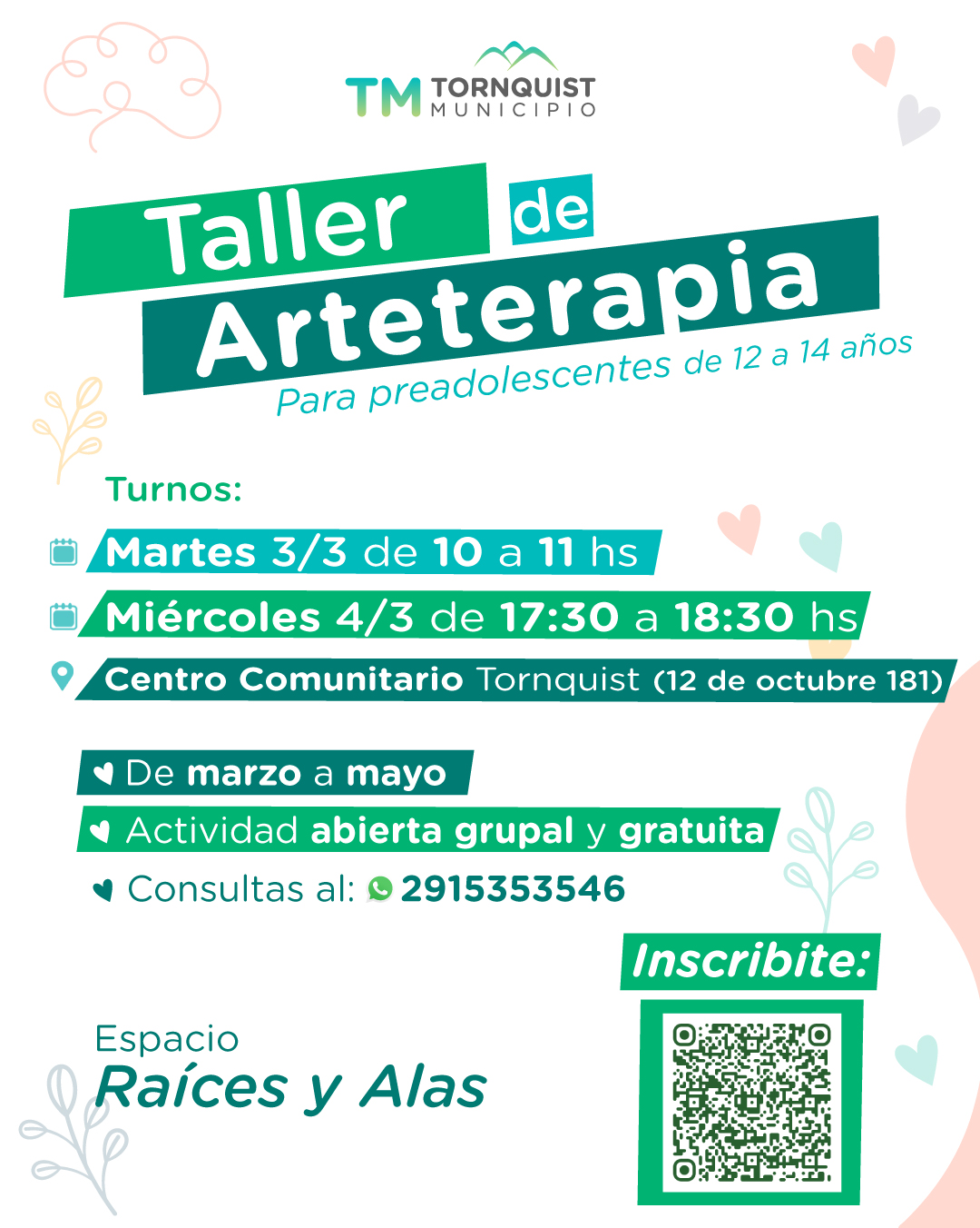 Impulsado por la Subsecretaría de Infancias y Juventudes de Tornquist Municipio, partir de marzo comenzará un Taller de Arteterapia destinado a preadolescentes de 12 a 14 años, una propuesta gratuita que busca brindar un espacio de expresión, creatividad y encuentro.