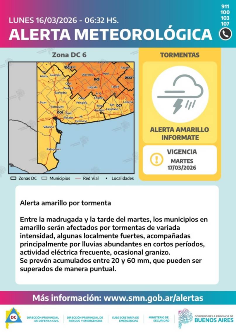 La advertencia climática abarca, además de nuestra ciudad, a los distritos de Coronel Rosales, Coronel Dorrego, Monte Hermoso, Patagones, Villarino, Puan, Saavedra, Tornquist, Coronel Suárez, Coronel Pringles, Adolfo Alsina, Guaminí, San Cayetano y Tres Arroyos.