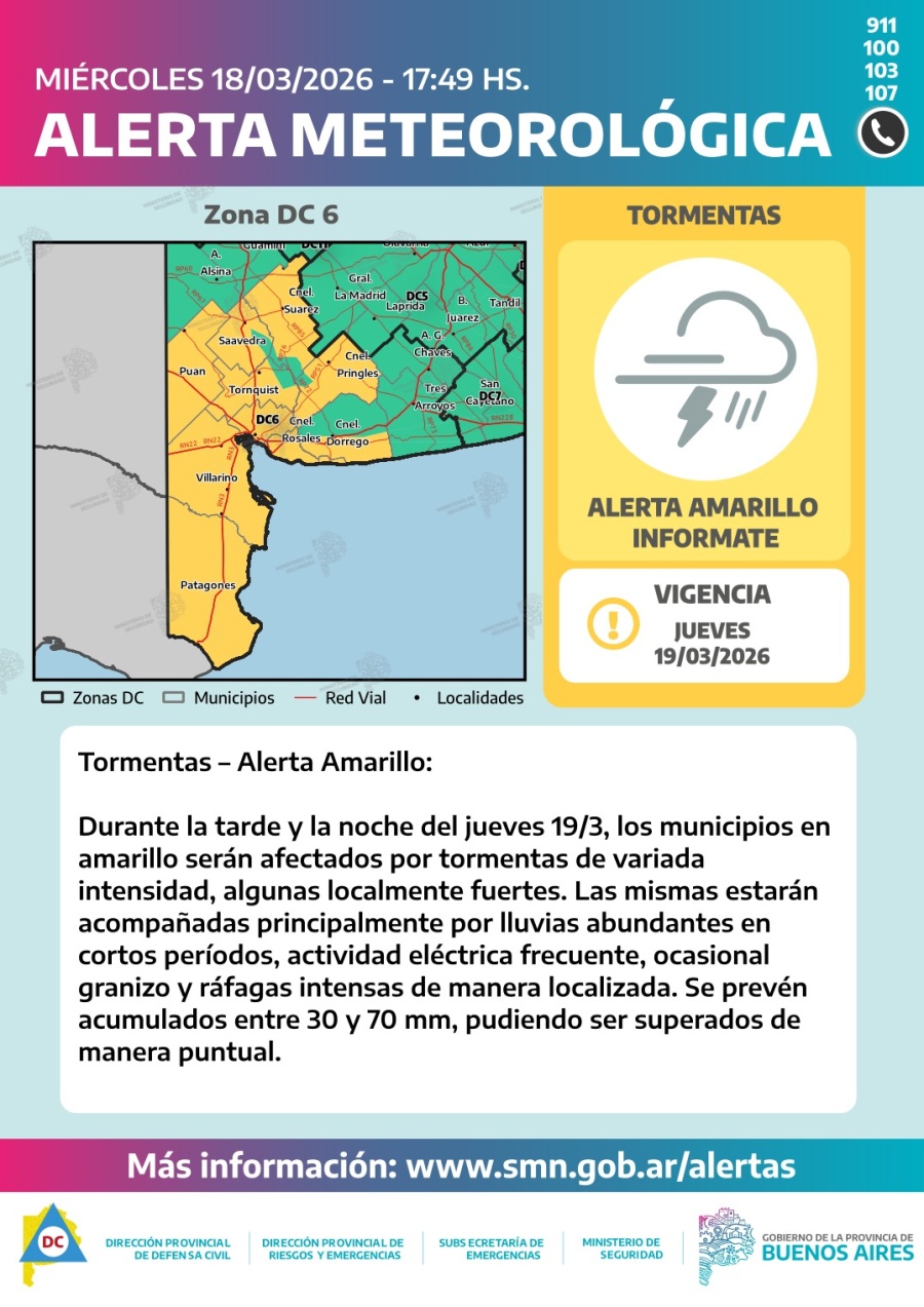 A partir de la madrugada del viernes, se prevé un nuevo período de inestabilidad sobre el sudoeste y el centro-oeste de la provincia, afectando la zona DC 6 y DC 11 principalmente, con lluvias y tormentas de variada intensidad, extendiéndose luego de sur a norte y de oeste a este a partir de las primeras horas de la tarde, afectando al resto del área en amarillo. Algunas tormentas pueden ser localmente fuertes, acompañadas principalmente por lluvias abundantes en cortos períodos, actividad eléctrica frecuente, ocasional granizo y ráfagas de hasta 70 km/h. Se prevén acumulados entre 30 y 70 mm, pudiendo ser superados de manera puntual.