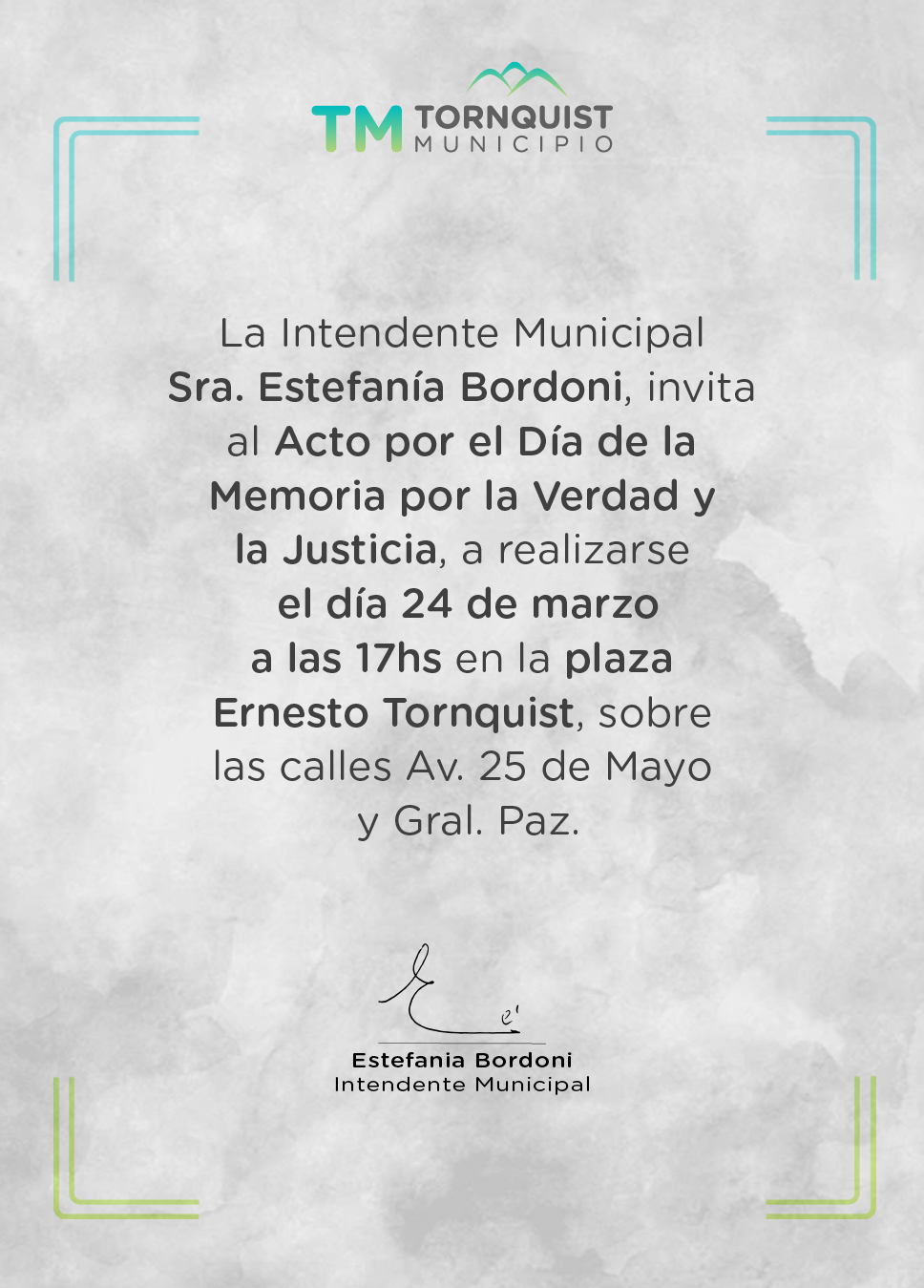 La Intendente Municipal, Estefania Bordoni, invita a la comunidad al acto el Día de la Memoria por la Verdad y la Justicia, a realizarse el martes 24 de marzo a las 17 hs en el Monumento de la Memoria de la Plaza ‘Ernesto Tornquist’ (Av. Gral. Paz y 25 de Mayo).