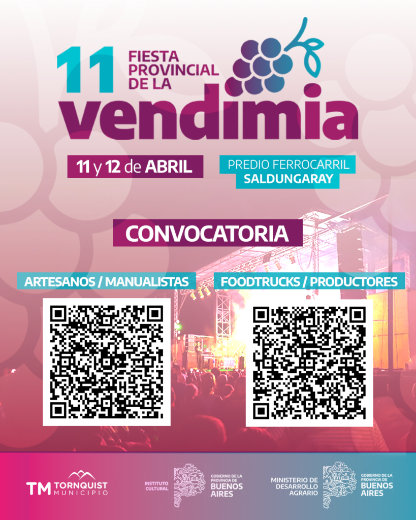 Hasta el 27 de marzo se encuentra abierta la convocatoria a gastronómicos y artesanos para la 11º Fiesta Provincial de la Vendimia, que se desarrollará los días 11 y 12 de abril en el Predio del Ferrocarril de Saldungaray.
