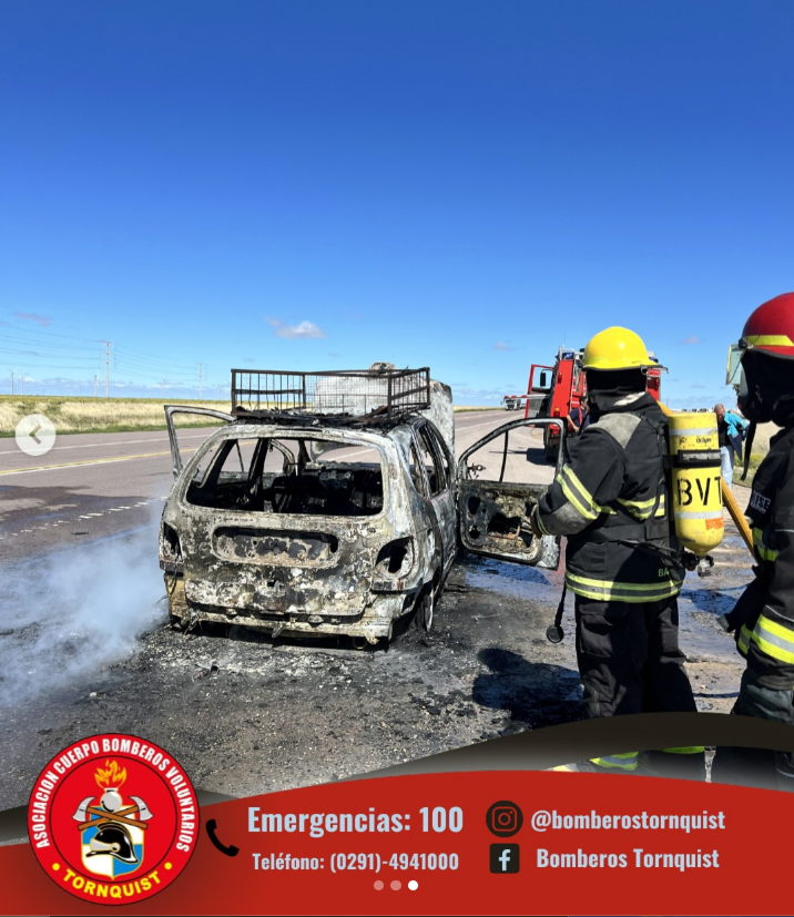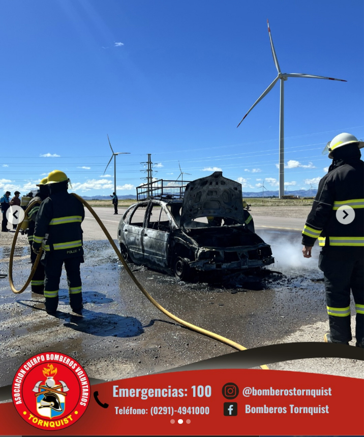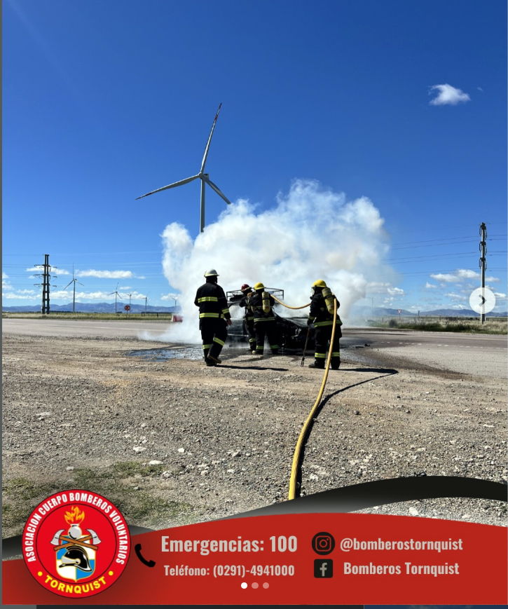 Durante la tarde de hoy Lunes 23/3/2026 a las 13:17hs se conovocó a laos Bomberos de Tornquist mediante sirena por un incendio vehicular en cercanias al Parque Eólico “Mataco – San Jorge” ubicado en Ruta Nacional 33 km 48.