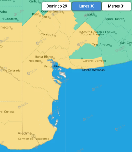 Las advertencias rigen para este lunes y el martes. abarca a los distritos de Bahía Blanca, Rosales, Dorrego, Monte Hermoso, Patagones, Villarino, Puan, Saavedra, Tornquist, Suárez, Pringles, Alsina, Guaminí y el sur de Dorrego.