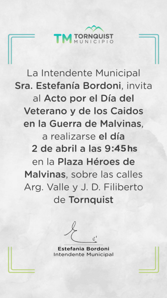 La Intendente Municipal, Estefanía Bordoni, invita al acto oficial por el Día de los Veteranos y los Caídos en la Guerra de Malvinas, a realizarse el jueves 2 de abril a las 9.45 hs en la Plaza ‘Héroes de Malvinas’, ubicada en calles Argentino Valle y Filiberto de Tornquist.