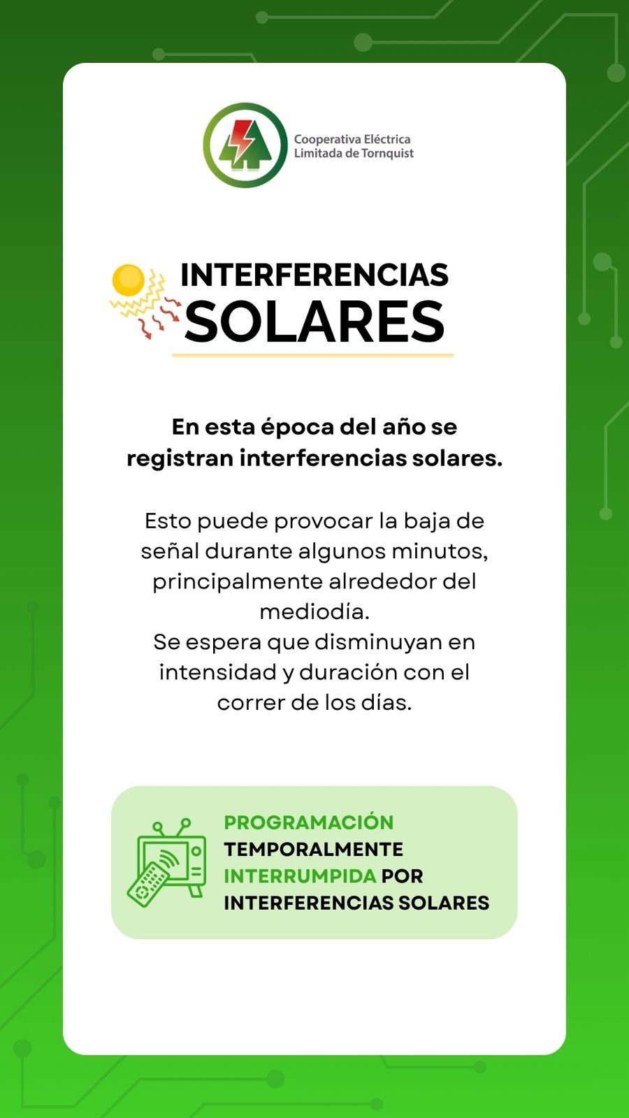 Esto puede provocar la baja de señal durante algunos minutos, principalmente alrededor del mediodía.
