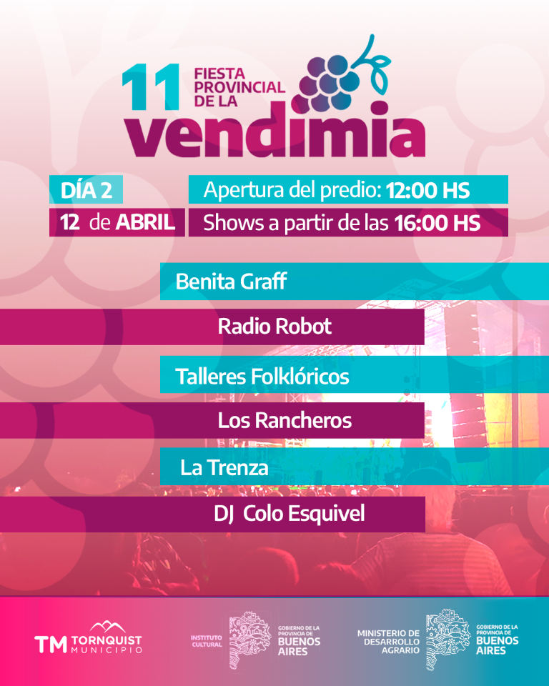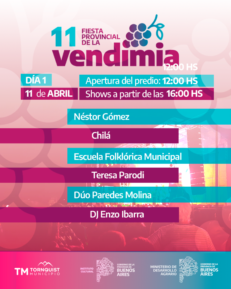 La localidad de Saldungaray será escenario de una nueva edición de la Fiesta Provincial de la Vendimia, que se llevará a cabo este sábado 11 y domingo 12 de abril, con una propuesta pensada para disfrutar en familia y celebrar la identidad productiva y cultural del distrito.
