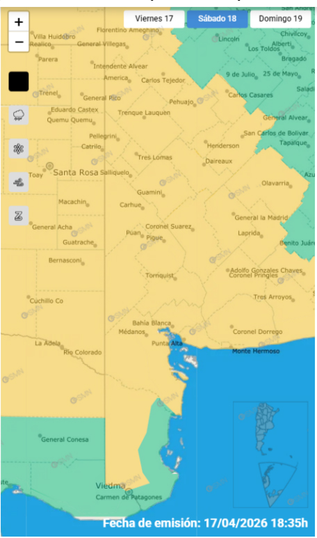 El Servicio Meteorológico Nacional (SMN) emitió una alerta amarilla por tormentas para Tornquist y buena parte del sudoeste bonaerense con vigencia para la tarde y la noche de este sábado 18 de abril.