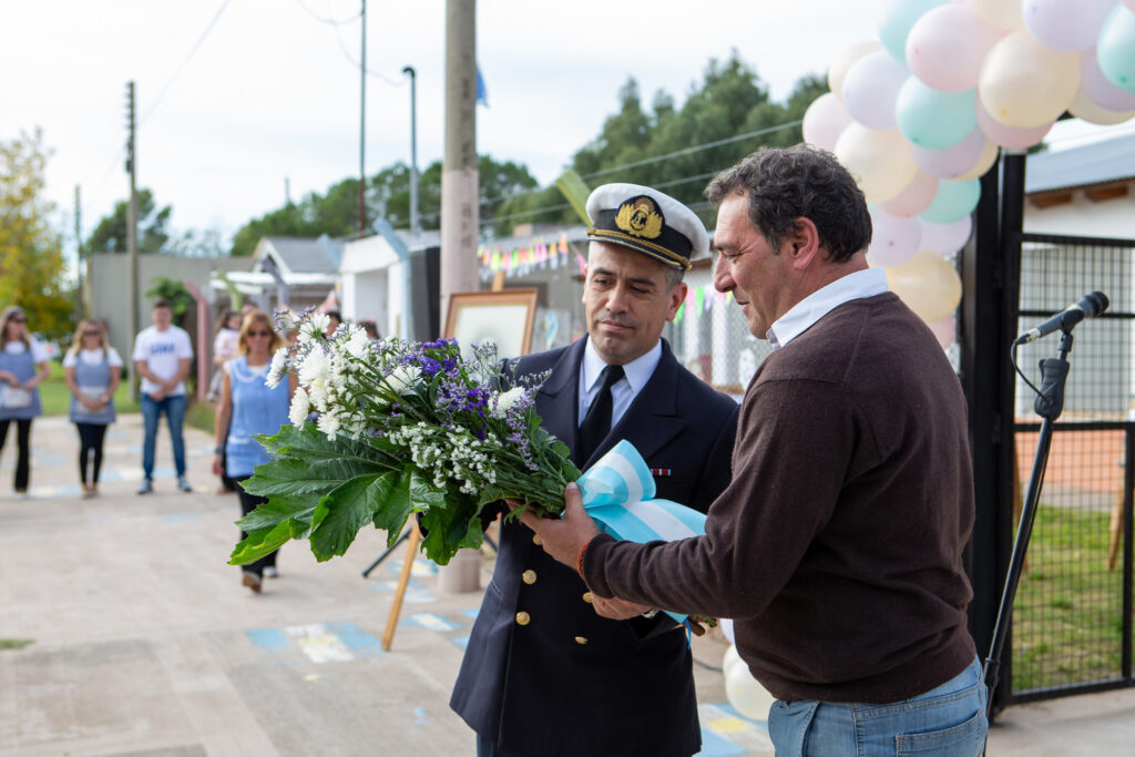 A continuación, Pelizza, junto a una docente del establecimiento y al padrino de la institución, Puerto Naval Belgrano , representado por la Corbeta Leiva Paredes, realizaron la colocación de una ofrenda floral al pie de la imagen del fundador, Ernesto Tornquist.