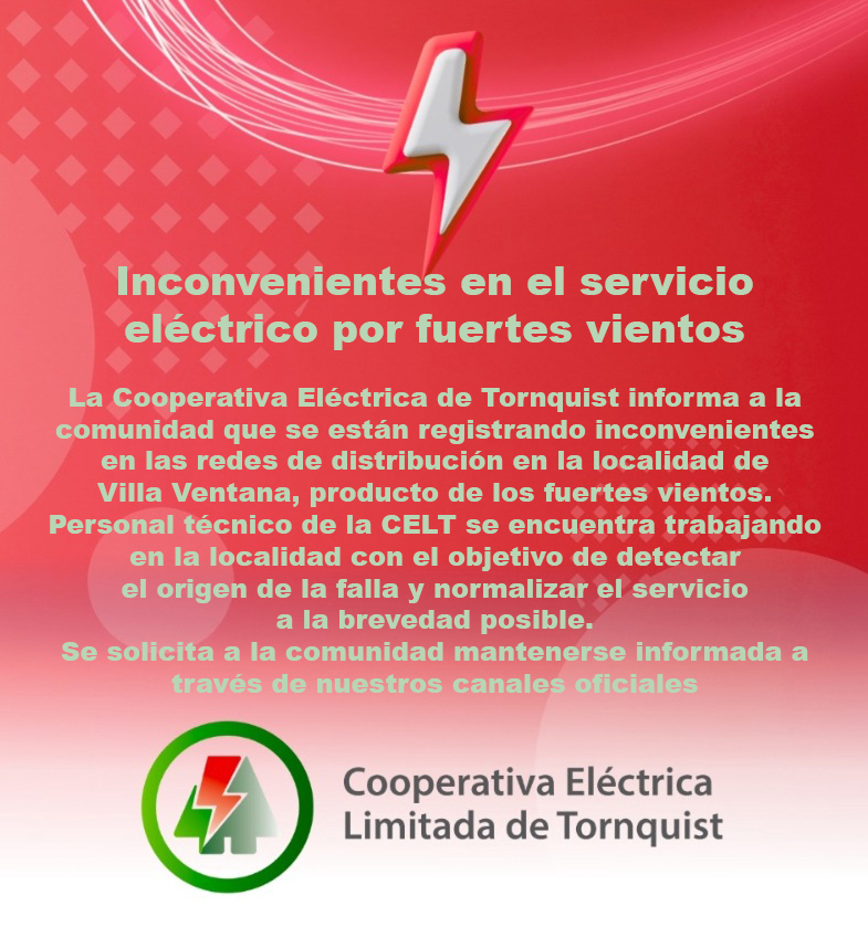 La Cooperativa Eléctrica de Tornquist informa a la comunidad que se están registrando inconvenientes en las redes de distribución en la localidad de Villa Ventana, producto de los fuertes vientos.